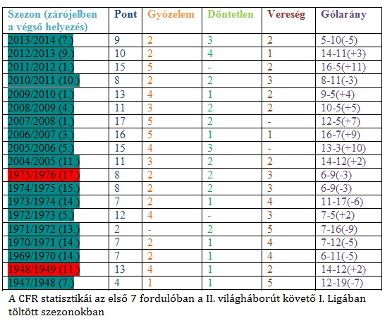 Persze 7 forduló adataiból túl sok következtetést nehéz lenne levonni, hiszen vannak olyan szezonok, mikor a bajnokság végén a tabella első felében tanyázó csapatokkal játszott a CFR az első 7 forduló alatt, olyan is akad, mikor kevésbé erős ellenfelek jutottak a szezonkezdésre és a '90 előtti időszak meccseiről pedig nehéz megmondani, hogy melyik mutatja az akkori mérkőzés valódi képét és melyik volt köszönhető a Párt akaratának.